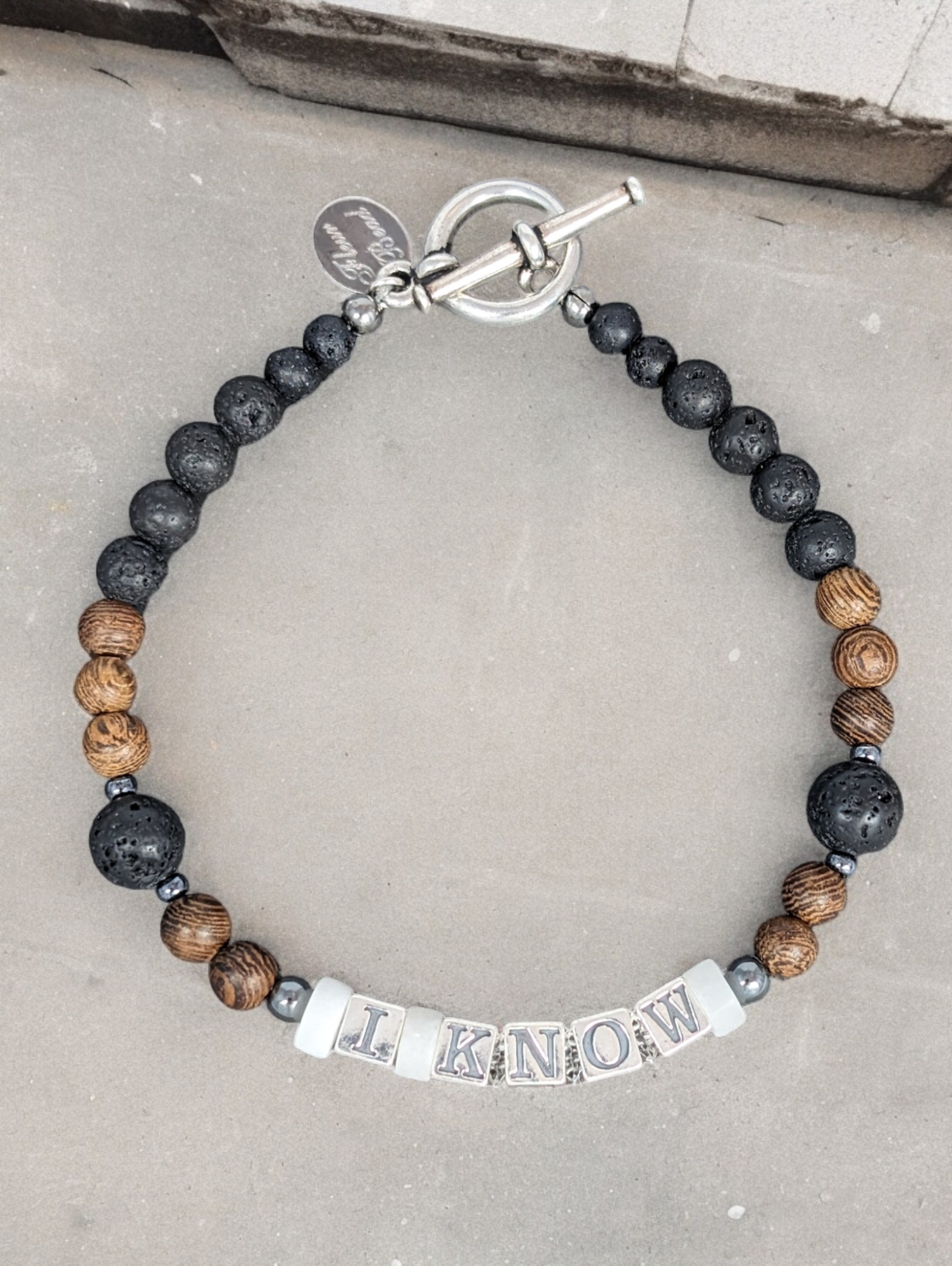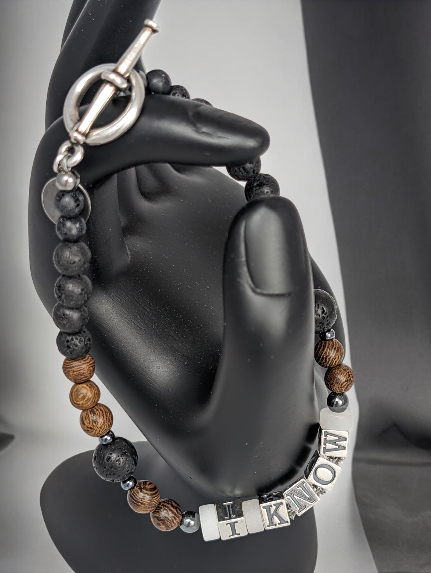 Han (I Know): Features sterling silver and pewter oxidized toggle, natural lava stone, hematite, and wood beads. White quartz spacers tie into the Leia design.