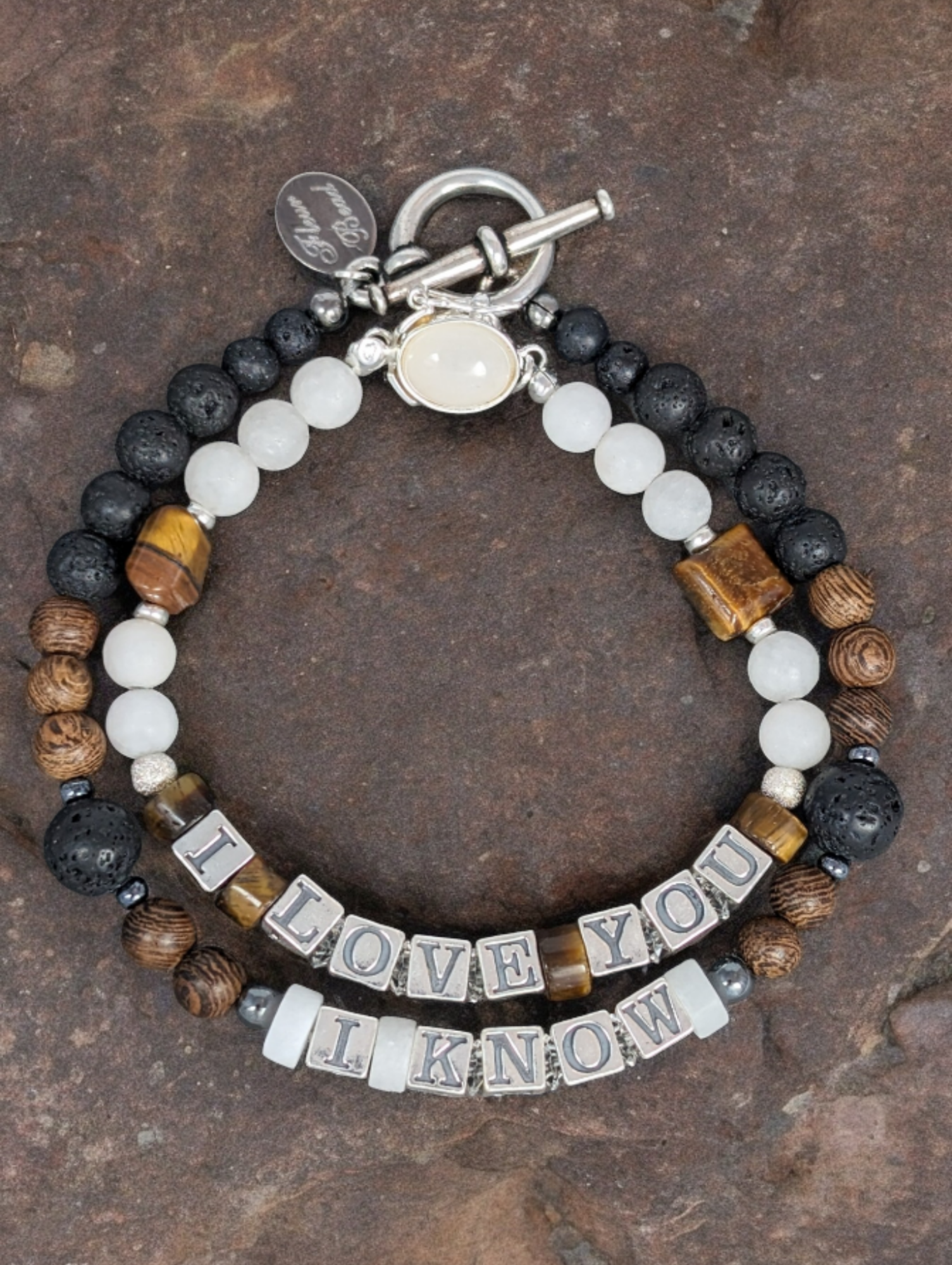 Leia (I Love You): Features a White Jade gemstone clasp and is adorned with stunning white quartz and Tiger's Eye gemstones.